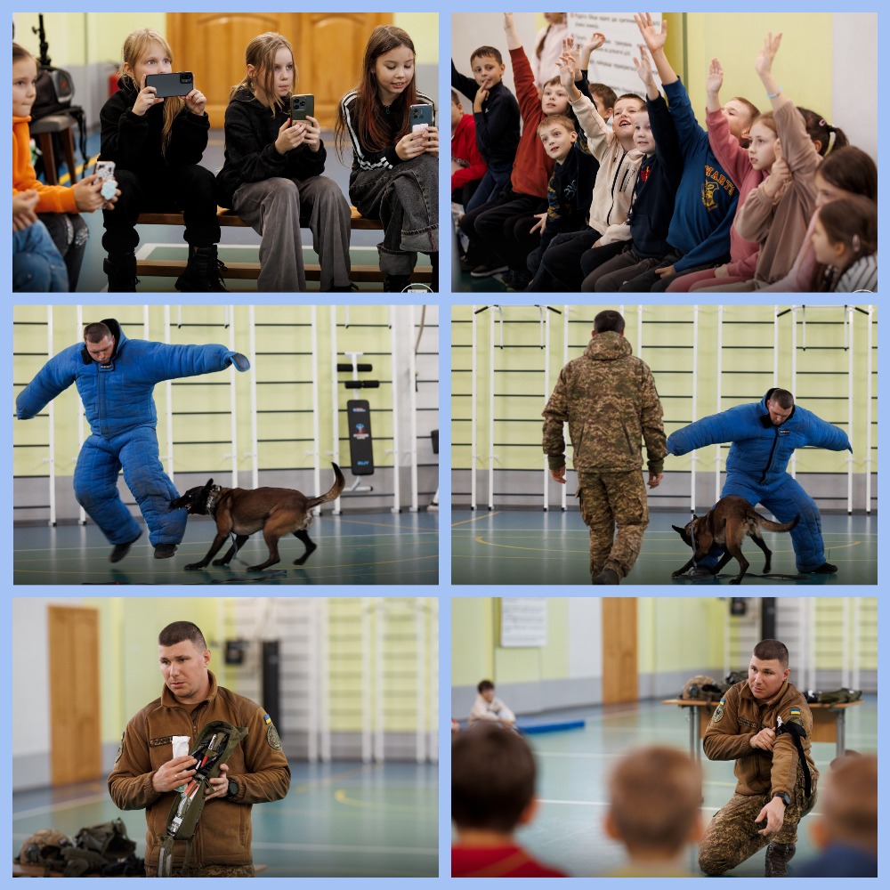 Окрему частину заходу провели кінологи: службова собака показала учням, як відбувається затримання умовного злочинця — це завжди захоплює й наочно демонструє важливість спільної роботи людини й чотирилапого напарника.